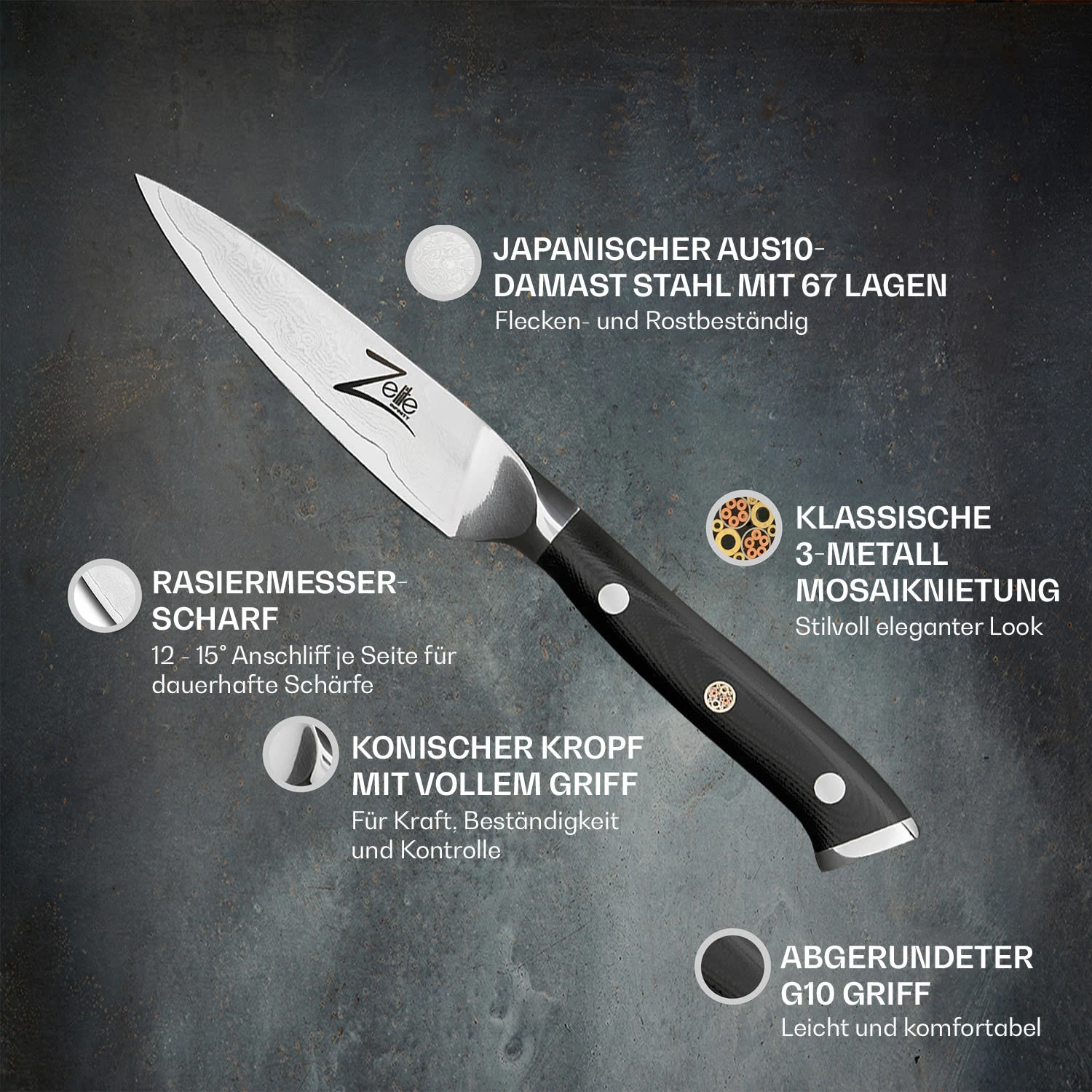 - mit 3-Metall-Mosaikniete in der Klinge